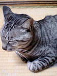 写真は雨なのに外に出て濡れ鼠になったトラ猫です。