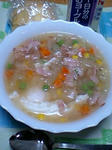 増えた体重が戻らないので、ちょこちょこストレッチと食事で頑張り中。これはベーコンとミックスベジタブルと玉葱みじん切りに、固形コンソメとお酒と塩コショウで味付けした簡単スープ。最後に玉子をぽとんと落としてひと煮立ちさせておわり。案外美味しいです。